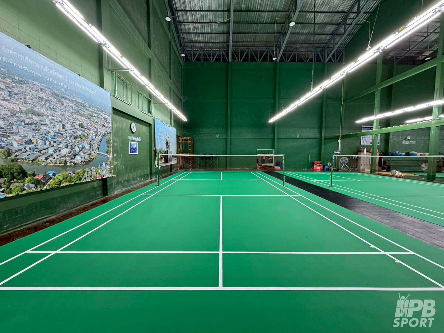 พื้นสนามรุ่น PB-T445 (PB Thailand National Flooring) แบบถาวร 6 สนาม และพื้นยางลายไม้ PB-W45 (Wonder Wood Flooring) สี Oak
